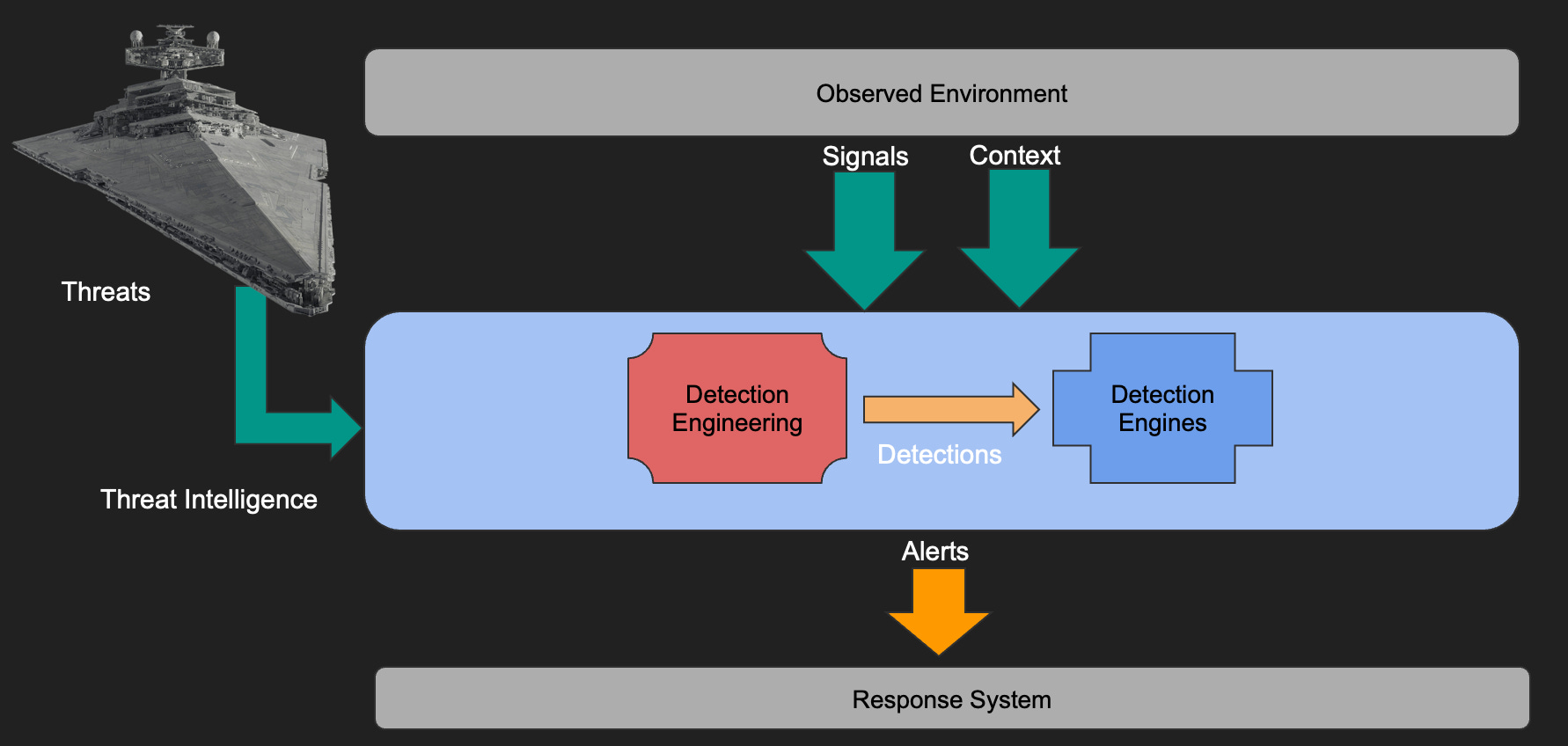 A threat detection system functions by ingesting signals and context from the observed IT environment, alongside threat intelligence. Detection engineering processes these inputs to create "detections" (rules, use cases, signatures), which detection engines then apply to identify malicious activity and generate alerts for a response system.