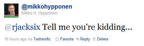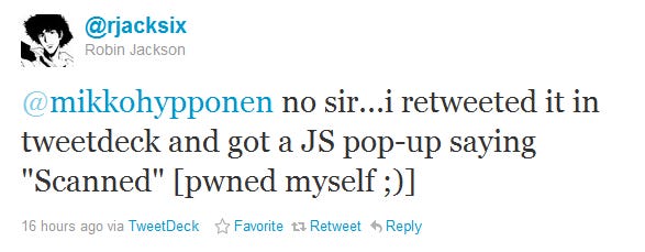 The security community working as it should. Collaboration, speed, effectiveness, no fussing around, quick response. Good to see it. Congrats to Mikko, Robin Jackson and the Tweetdeck (Twitter) guys.